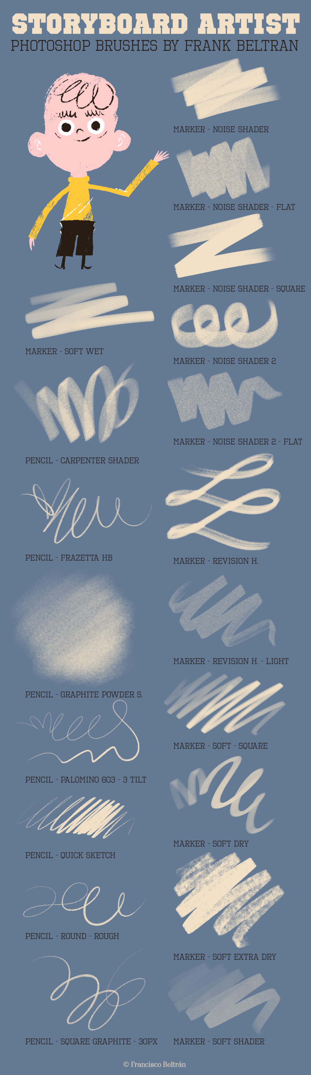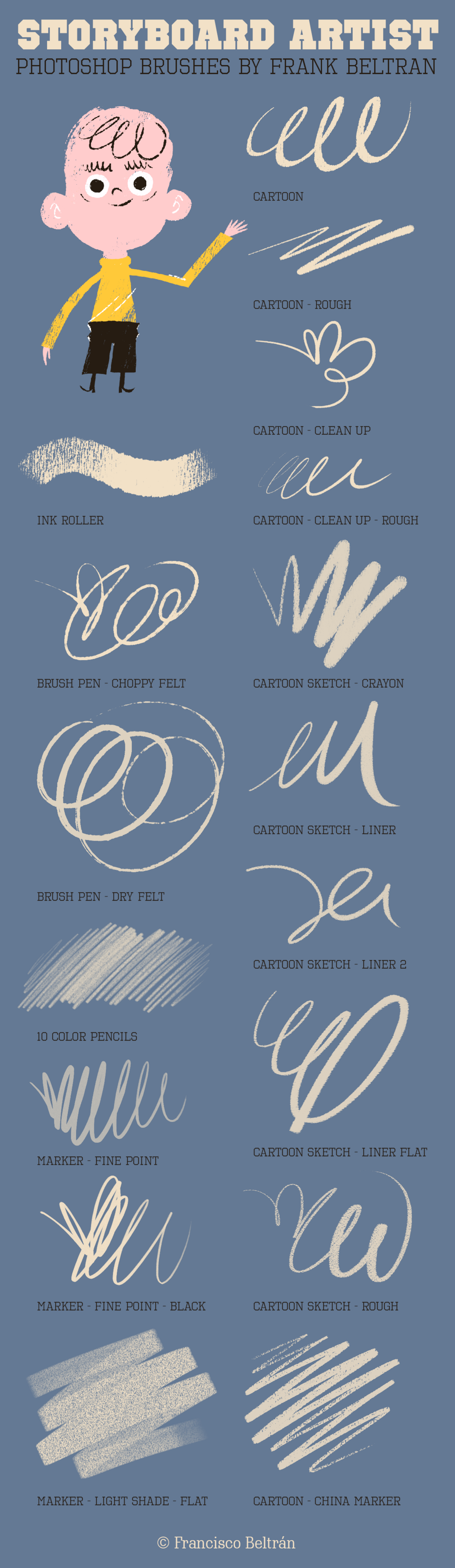 46 Tool Preset Brushes for Storyboarding, Cartooning, Animation, Comics, Poster Design, Graphic Design... Click on the images to see the brushes list.